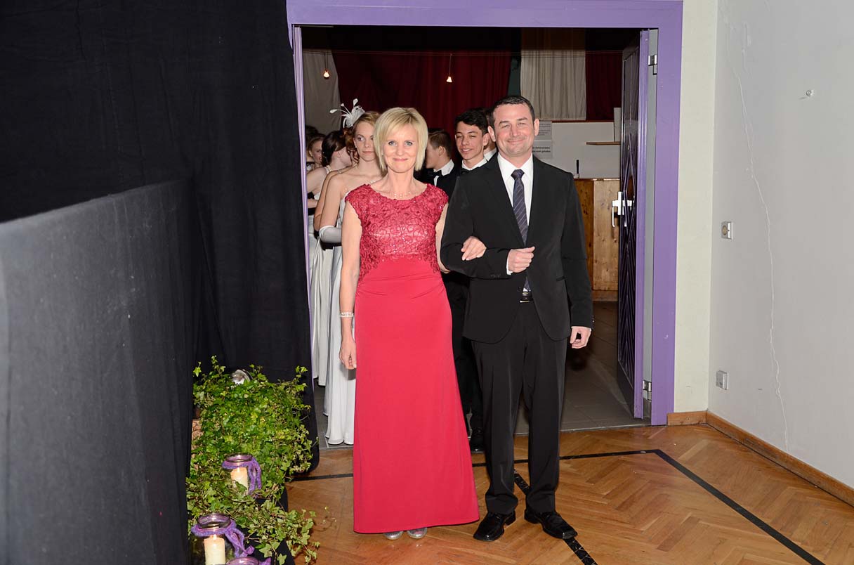 Zwischen den Debütantenpaaren sind unsere Ehrendame Elisabeth Hagelmüller und Turnwart Mag. Alexander Moosmayr zu sehen.